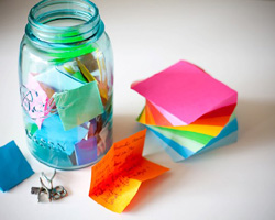C’est tout simple: trouvez un joli bocal, et tout au long de l’année remplissez-le de papiers de couleurs (c’est plus joli) sur lesquels vous notez tous les bons moments, les réussites, les événements positifs que vous vivez. A la fin de l’année, vous le videz pour redécouvrir la formidable années que vous venez de vivre!